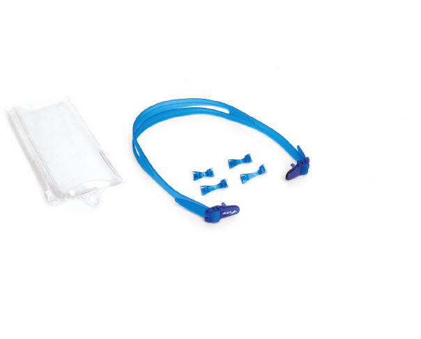 Besteht aus einem schwarzen Silikonkopfband mit zwei schwarz-grauen Schnallen, vier rauch-grauen PC-Nasenstegen und einem Kunststoffetui mit Reißverschluss.